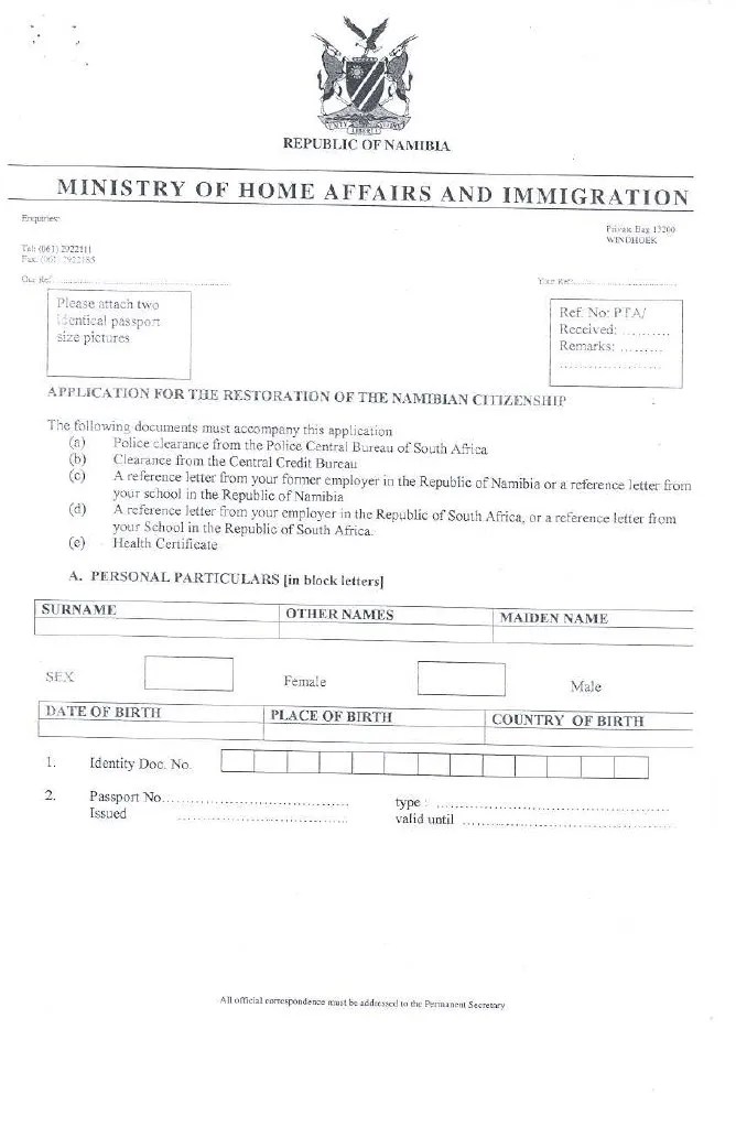 Application for the Restoration of Citizenship Namibian Home Affairs