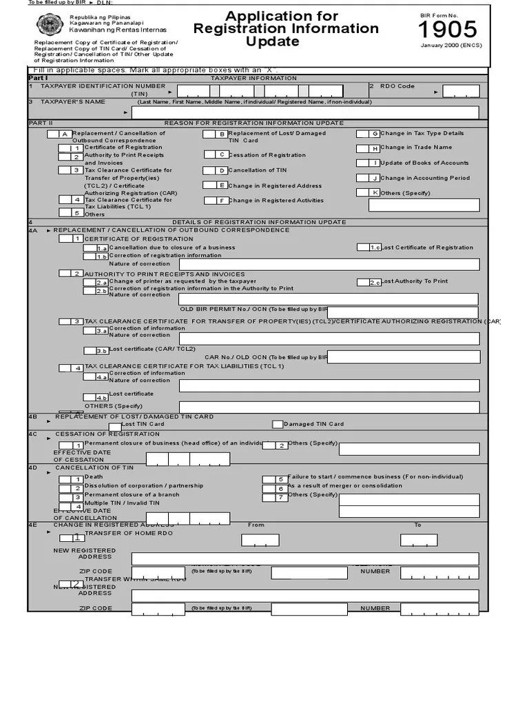 Application for bir form no. Submit bir form 1905 at the rdo or concerned office under the large taxpayer. Web mark all appropriate boxes with an “x”. Web steps in registration. Web bir form 1905 is used to transfer your records from your previous revenue district office (rdo) to 24/7 customer’s rdo.