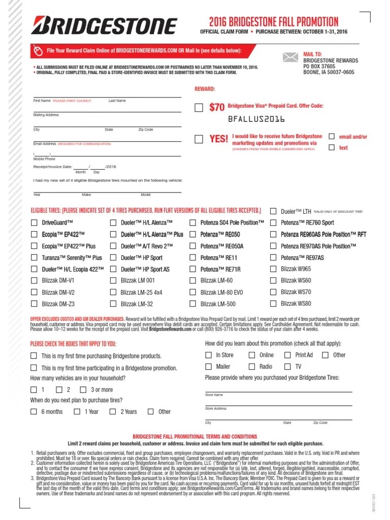 Thank you for being a valued customer. Get $70 back by mail on a bridgestone visa® prepaid. Web the official reward claim form will list the services and/or products that qualify for your reward. Web get up to $100 back by mail® on a bridgestone visa prepaid card. Look for the exact name of the product or service you purchased.