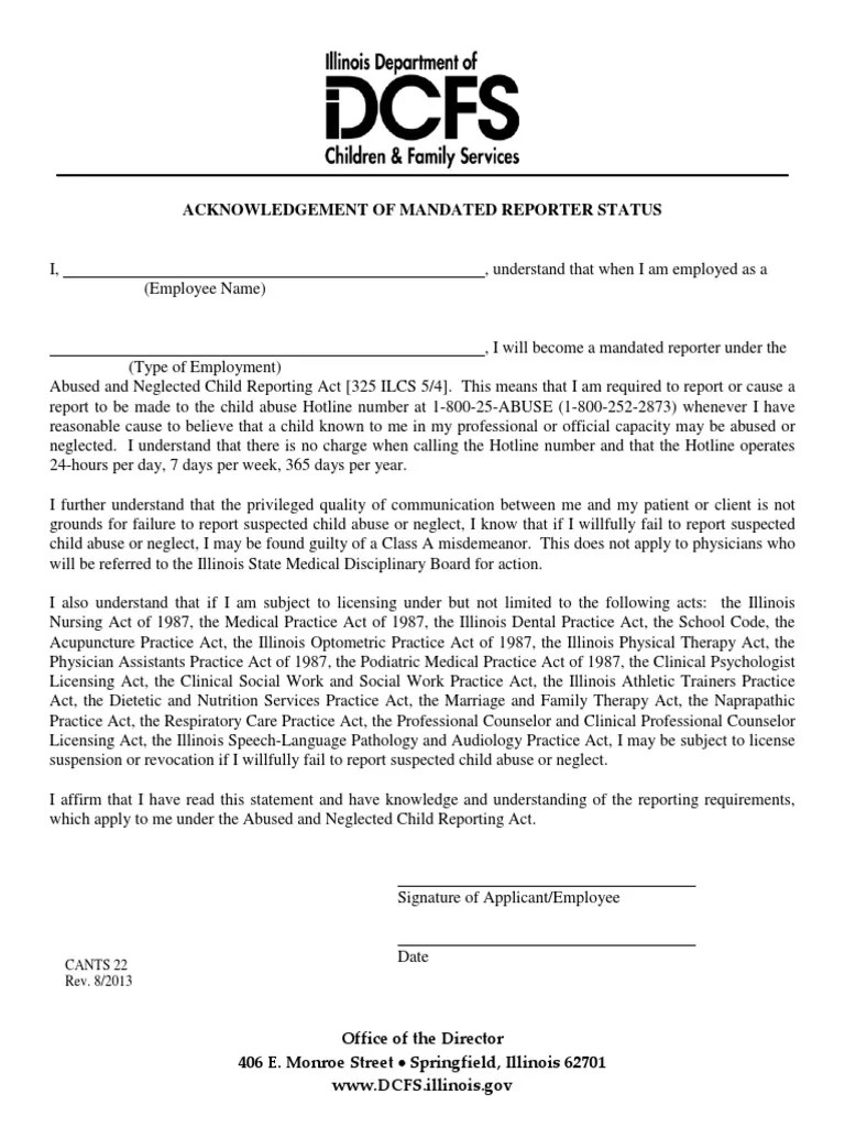 This means that i am required to report or cause a. Cants 4 or cants 5 form and. Web abused and neglected child reporting act [325 ilcs 5/4]. Mandated reporters cants 8 notification of a report of suspected child abuse and/ or neglect. 10/00 state of illinois department of children and family services written confirmation of suspected child abuse/neglect report:.