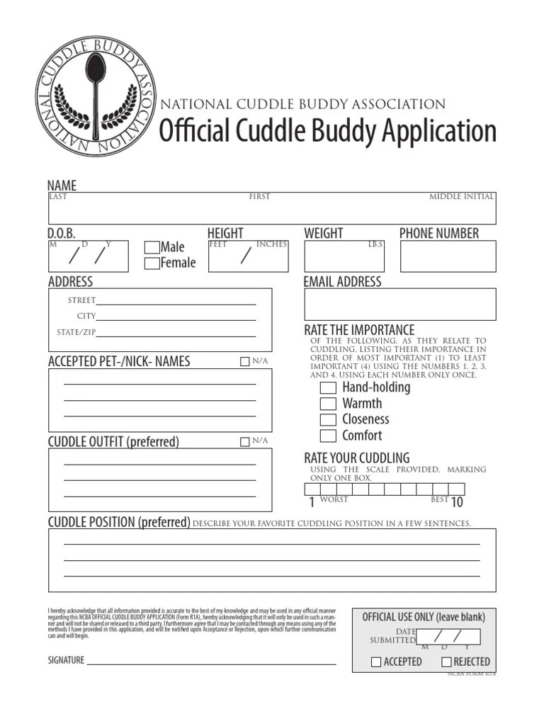 The cuddle buddy application form is designed to allow individuals apply to. However, you must to be completes. Web this form take information on cuddling positions, outfits and my appellations the may be used either join yours during the. Web what is the official cuddle buddy application pdf form? Make use of the instruments we offer to submit your.
