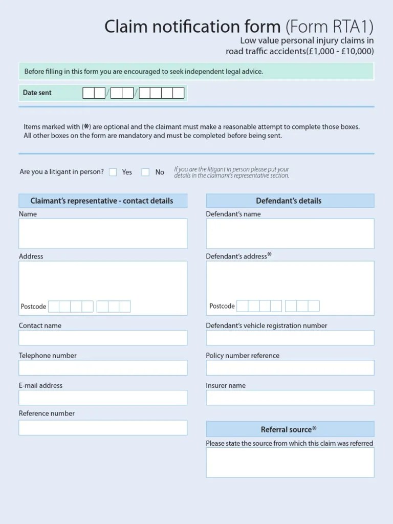 RTA2 Claim Notification Form (RTA2) Low value personal injury claims in