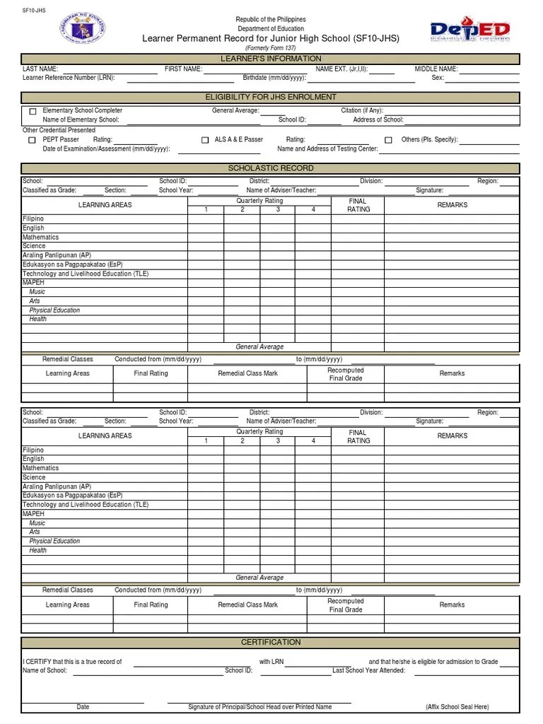 School Form 10 SF10 Learners Permanent Academic Record for Junior High