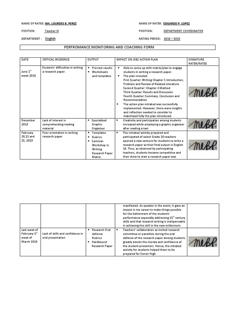 Performance Monitoring And Coaching Form SY 2019 2020 Educational