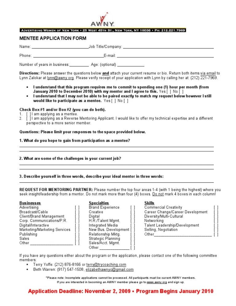 The more information that you complete, the easier. Prior to completing this form,. Web application form for youth mentee participants 1334 valley drive rock valley, ia 51247; Web eastern district of new york. Web mentee application mentoring is a special partnership between two people based on commitment to the mentoring process,.
