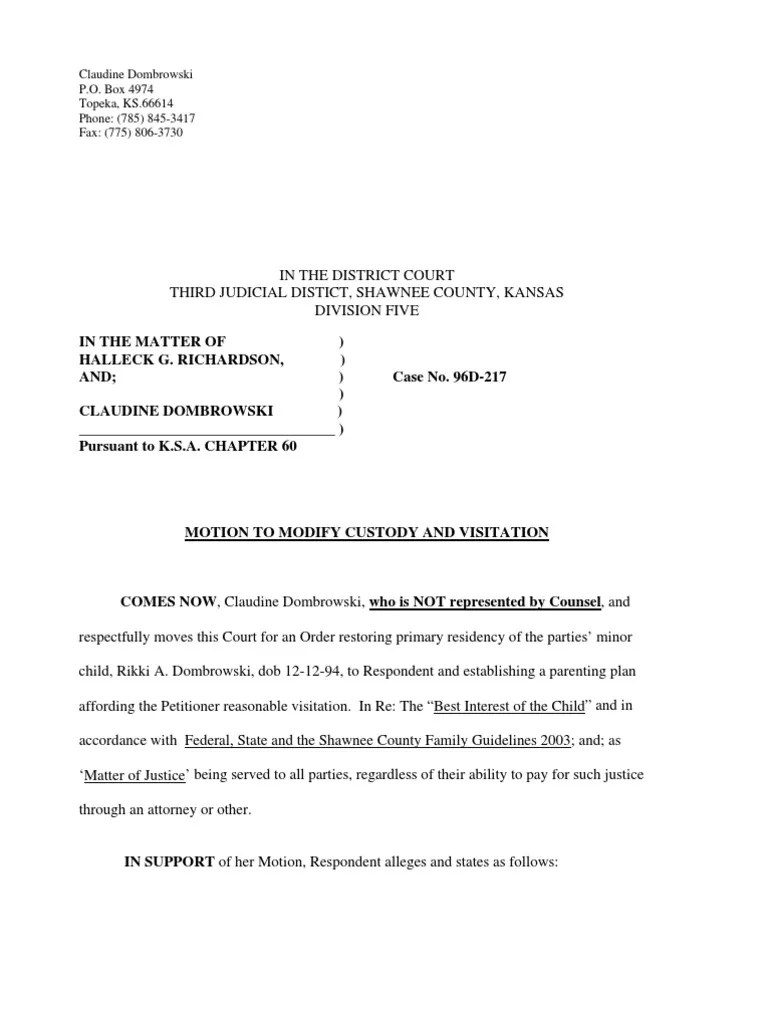 July 2005 Motion To Change Custody PDF Child Custody Mother