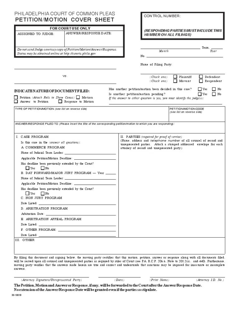 Petition/Motion Cover Sheet Philadelphia Court Of Common Pleas