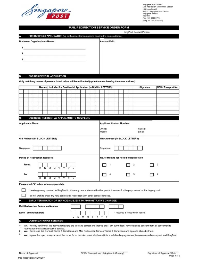 SingPost Mail Redirection Application Form (v201607) Mail Written