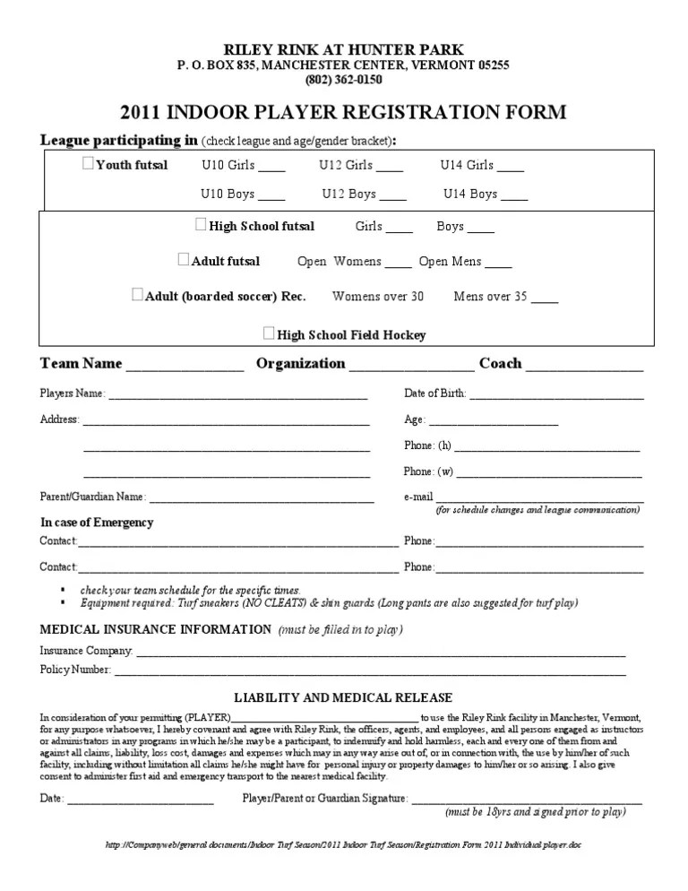 2011 Indoor Soccer Player Registration Form Indemnity Government