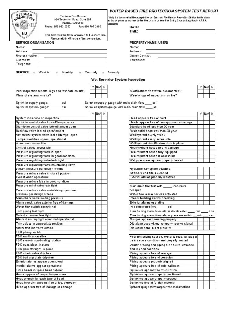 W Evesham NFPA25 Sprinkler Test Form For Contractors Fire Sprinkler