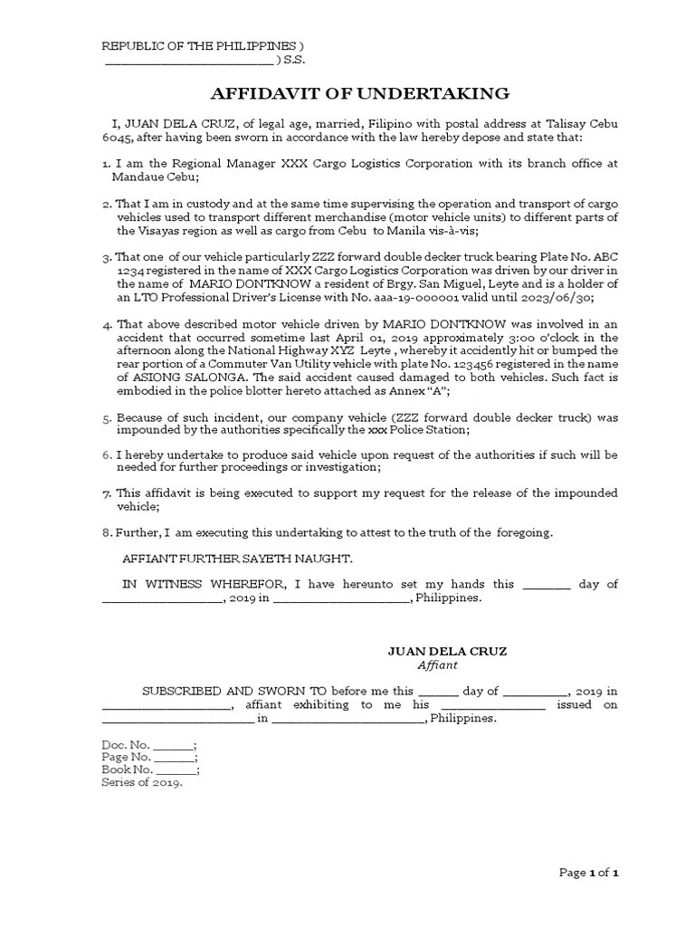 Affidavit of Undertaking_To Release Impounded Vehicle Affidavit