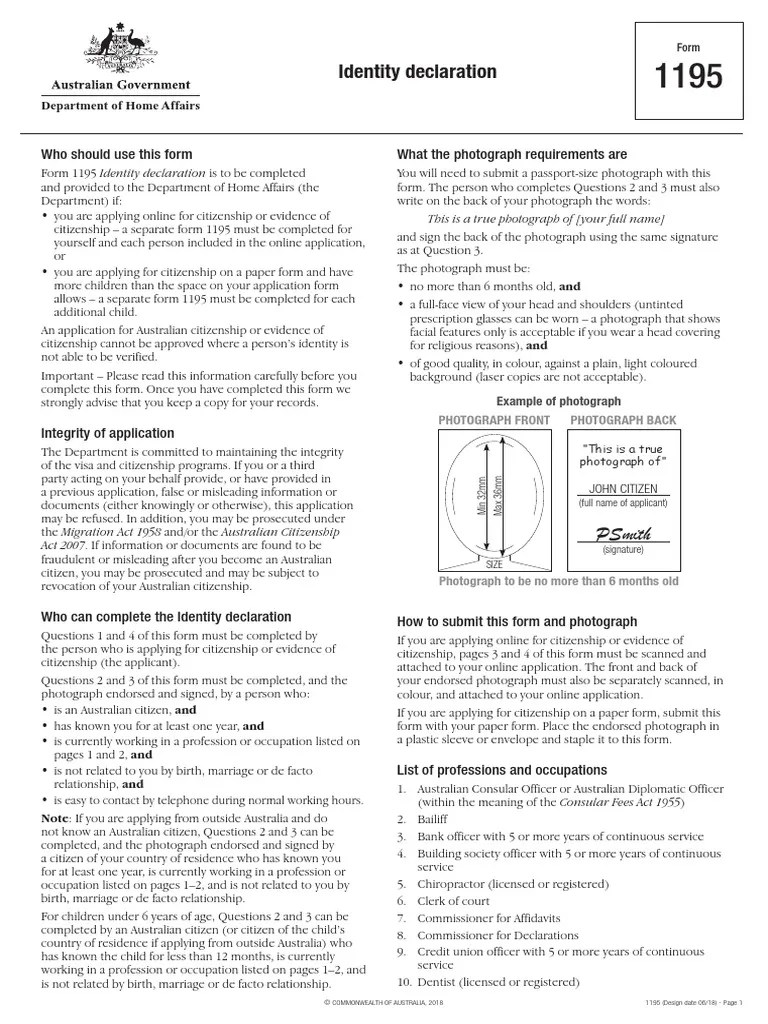 I just have a quick question about the form 1195 identity declaration for citizenship application. Skip to content call 02 9723 8080 1300 287 911 1300287911 about us why choose us? Our team our fixed fees family law divorce & separation parent & children matters Questions 2 and 3 of this form must be completed, and the photograph endorsed and.